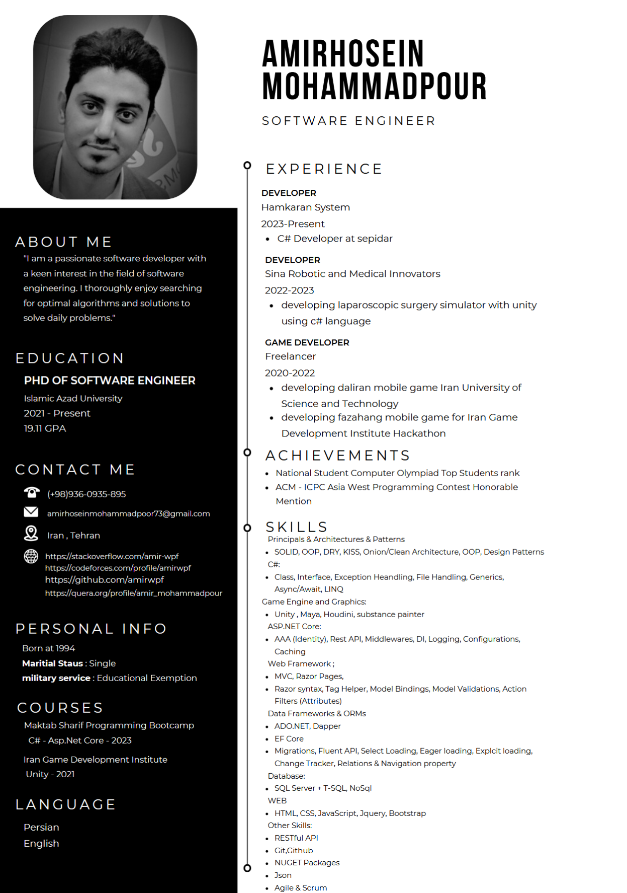 تجربه‌ی کاری من شامل فعالیت در همکاران سیستم،سینا مد ، سدید افزار و تدریس در مکتب شریف است. مهارت‌هایم شامل .NET، Domain-Driven Design و Unity Engine می‌شود. به حل مسئله، توسعه‌ی محصول و بهینه سازی علاقه‌مندم.